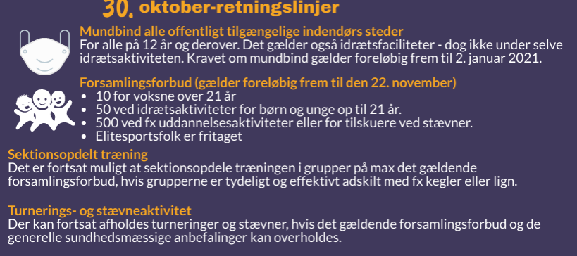 Fredag den 23. oktober indførte myndighederne nye landsdækkende restriktioner, som igen påvirker vores muligheder for at dyrke vores sport.