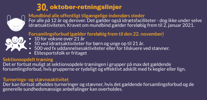 Må en træner stå for aktiviteter i flere grupper af 10? Ja, en instruktør eller træner gerne må have ansvaret for aktiviteterne i flere grupper, HVIS han/hun sørger for fysisk kun at være en del af den ene gruppe. Grupperne skal være effektivt adskilt, og der bør være enten personale eller frivillige til stede under aktiviteterne, der har til opgave at forebygge opbygning af tætte forsamlinger. Det kunne fx være en håndboldtræner eller en gymnastikinstruktør for et voksenhold, som instruerer den ene gruppe og samtidig på afstand har ansvaret for aktiviteterne i en anden gruppe, som opholder sig i en anden sektion i hallen. Vær særligt opmærksom på, at grupperne ikke flettes i forbindelse med ankomst og afgang fra idrætsfaciliteten. Hvad er op og ned på forsamlingsforbuddene 10, 50 og 500 i regi af idrætten? Forsamlingsforbud på 10 personer gælder voksne fra 22 år og derover. En evt. træner, frivillig eller dommer tæller med i det samlede antal. Forsamlingsforbud på 50 personer gælder for idræts- og foreningsaktiviteter uden overnatning for børn og unge til og med 21 år. Der må gerne være nødvendige voksne til stede som en del af forsamlingen på 50 personer. En nødvendig voksen er en træner, hjælpetræner eller en forælder ved forældre/barn hold, hvis tilstedeværelse er nødvendig for, at aktiviteten kan udføres forsvarligt. Der må ikke blandes voksne udøvere med ungdomsudøvere. Hvis blot én 22-årige deltager som udøver, gælder forsamlingsforbuddet på 10 personer Forsamlingsforbud på 500 personer ved fx kursus-og uddannelsesaktiviteter, tilskuere eller professionelle/elite udøvere. Det er et krav, at man i al væsentlighed sidder ned på faste pladser med ansigtet i samme retning. Voksne og unge over 21 år: Må der afvikles træning i flere grupper af max 10 i samme hal, bane eller lign.? Ja, det må klubberne gerne, hvis følgende kan overholdes: Hver gruppe må max være på 10 personer inkl. træner Der skal være tilstrækkelig afstand mellem grupperne – gerne mindst 2 meters afstand. Anvend fx kegler, toppe, snor, kridt eller anden tydelig markering, som klart afgrænser banen/zonen. HUSK, at den pågældende træner tæller med i det gældende forsamlingsforbud på 10. Hvad er reglerne for brug af mundbind ved idrætsaktiviteter? Med virkning fra den 29. oktober og foreløbig fire uger frem skal alle personer over 12 år bære mundbind i offentligt tilgængelige steder indendørs – også idrætsfaciliteter. Der skal bæres mundbind ved ankomst og afgang til omklædningsrum eller hal, hvis man møder omklædt. Kravet om mundbind gælder IKKE deltagere under selve idrætsaktiviteten dvs. udøvere, trænere, officials, dommere mv. fritages under aktiviteten. Gælder forsamlingsforbuddet på 50, hvis vi primært er børn og unge under 21 år, men har en enkelt eller to unge på 21 år eller derover? Nej, i det tilfælde er det forsamlingsforbuddet på 10, der gælder. Voksne/unge over 21 år må ikke deltage i aktiviteter og arrangementer med over 10 personer til stede, uagtet om de resterende deltagere er omfattet af undtagelsen for idræts- og foreningsaktiviteter børn og unge op til 21 år. Hvor går grænsen for, om man hører med i gruppen børn og unge? Man tæller med i kategorien børn og unge, når man er til og med 21 år. Kulturministeriets retningslinjer nævner, at der gerne må være nødvendige voksne til stede ved afvikling af idrætsaktiviteter for børn og unge under 21 år. Hvad er definitionen på en nødvendig voksen? En nødvendig voksen er en træner, hjælpetræner eller en forælder ved forældre/barn hold. En tommelfingerregel er, at de voksne, som var nødvendige for at gennemføre idrætsaktiviteten før de nye restriktioner, også må forventes at være nødvendige, efter de nye restriktioner er blevet indført. Hvad er definitionen på en professionel udøver? Definitionen på en professionel udøver er, at den pågældende dyrker idræt på højeste nationale seniorniveau inden for en DIF-anerkendt idrætsgren. Dette er en ændring i bekendtgørelsen, som udvider definitionen betydeligt. (Se §14, stk 4 i bekendtgørelsenom forbud mod store forsamlinger) Hvor mange må man være ved uddannelsesaktiviteter? I må maksimalt være 500 inkl. undervisere. Bemærk, at alle kursister skal sidde med næsen i samme retning. (Se §3, nr. 5 i bekendtgørelsen om forbud mod store forsamlinger) Må vi afholde stævner? Ja, hvis I kan afvikle stævnet inden for det gældende forsamlingsforbud dvs. 10 for voksne over 21 år inkl. træner, dommer, officials mv. og 50 for børn og unge til og med 21 år. I særlige tilfælde må der dog gerne afholdes arrangementer med flere deltagere end det gældende forsamlingsforbud, så længe der aldrig er samlet flere deltagere end det gældende forsamlingsforbud samme sted på samme tid. Der må således gerne arrangeres tidsforskudte arrangementer, eller hvor arrangementet afholdes med en betydelig geografisk spredning mellem deltagerne. (læs mere i Q&A) Må der være gengangere ved tidsforskudte dele af et stævne (fx dommere eller officials)? Ja, der må gerne være gengangere mellem personerne i de forskellige tidsforskudte dele af et stævne. Eventuelle gengangere tæller med i det samlede antal personer i alle de tidsforskudte dele af stævnet, som gengangerne deltager i. Må vi gennemføre vores træningslejre med overnatning? Nej, ikke som udgangspunkt – kun, hvis I kan holde jer under 10 eller falder ind under betegnelsen professionelle udøvere.