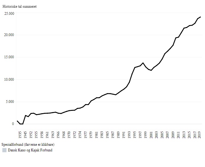 For 20. år i træk kan Dansk Kano og Kajak Forbund (DKF) notere sig medlemsfremgang. Der er nu officielt 24.004 medlemmer. Fordelt på 2.041 under 18 ( 2.341 i 2018), 1.115 19-24 årige (1.118 i 2018), 14.826 25-59 årige (14.571 i 2018) og 6.022 over 60 år (5.601 i 2018). Årets tal betyder i procent en fremgang på 1,6 % (373 medlemmer). DKF´s udvikling skal ses i lyset af, at den organiserede idræt i disse år oplever, at historisk mange bliver medlemmer i idrætsforeningerne. For første gang nogensinde har Danmarks Idrætforbund og DGI tilsammen mere end 2,3 millioner medlemmer. En del af forklaringen skal findes i, at de to organisationer siden 2014 i Bevæg dig for livet har samarbejdet om at gøre Danmark til verdens mest aktive nation. DKF og DGI Kano og Kajak har i Bevæg dig for livet-projektet, oplevet en en fremgang på 2,6 % (800 medlemmer) fra 2018 til 2019. De øvrige på og i ‘vandet’ Ser vi på nogle af de forbund, der er PÅ vandet, så er der en lille tilbagegang for `Vandski & Wakeboard´ -2,8% (-63 medlemmer). `Sejlunionen´ går frem med 1,6% (310 medlemmer). `Roning´ går frem med 1,6% (257 medlemmer). Dansk Surf og Rafting Forbund går frem med 5,5% (147 medlemmer). I vandet går `Svømning´ frem med 1,7% (3.193 medlemmer), `Triathlon´ går til bage med -8,5% (-590 medlemmer) mens `Sportsdykkerne´ går tilbage med – 1,7% (-128 medlemmer). DKF alderssammensætning Når DKF’s tal studeres i detaljen viser det sig, at der også i år bliver færre medlemmer under 18 år. (-300). Det står i skarp kontrast til konkurrencestatistikkerne, der viser flere deltagere. Det påkalder sig opmærksomhed, fordi DKF’s strategi satser på vækst i den gruppe. Til gengæld har 60+ og 70+ grupperne bidt sig fast. Igen i år er der stor fremgang i disse grupper. DKF geografisk Geografisk er de største stigninger i medlemsantallet i Køge (34%), i Roskilde (29%) og i Varde (20 %). Klik på kortet nedenfor, så har du mulighed for at se, hvordan kajak-, kano- og SUP-interessen har udviklet sig i din kommune.